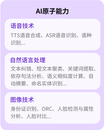 使用NLP、ASR、TTS、CV等技術(shù),為應(yīng)用開發(fā)提供文本、語音、圖像處理的API,將基礎(chǔ)AI能力原子化,通過AI接口調(diào)用、業(yè)務(wù)邏輯整合,就能實現(xiàn)AI業(yè)務(wù)需求,達到低成本、可復(fù)用、普惠AI的目的。